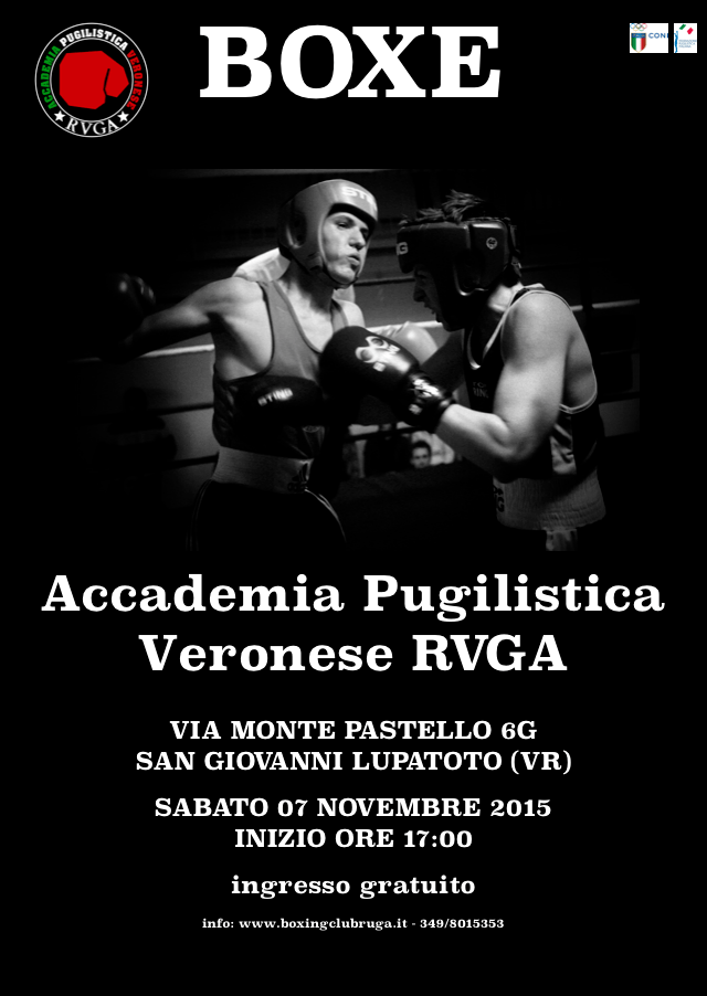 Sabato 07/11/2015 avrà luogo la riunione pugilistica organizzata dall’Accademia Pugilistica Veronese RVGA presso la propria sede di Via Monte Pastello 6G a San Giovanni Lupatoto (VR): per la squadra di casa combatteranno Luca Canteri, Francesco Castagnini, Adelrahman Kassem, Mohammad Kassem, Matteo Meneguzzi, Robert Michelone e Lorenzo Signorini.
