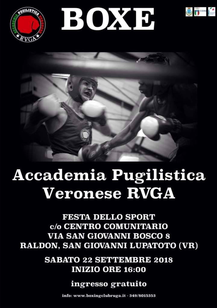 Sabato 22/09/2018 avrà luogo la riunione pugilistica organizzata dall’Accademia Pugilistica Veronese RVGA in occasione della Festa dello Sport del Comune di San Giovanni Lupatoto presso il Centro Comunitario di Via San Giovanni Bosco 8 a Raldon (VR): per la squadra di casa combatteranno Luca Canteri, Michele Ferri, Jacopo Filippi, Giuseppe Goliuso, Islam Kapllani, Abdelrahman Kassem e Camilla Savioli.