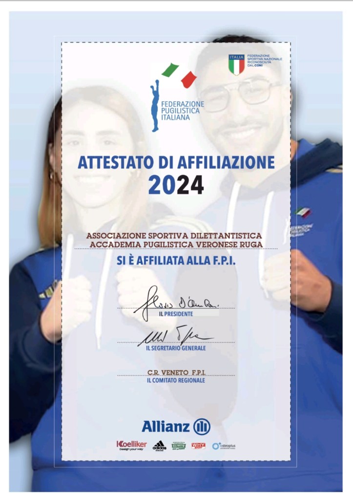 Anche per la stagione sportiva 2024 l’Accademia Pugilistica Veronese Ruga, come previsto dalla legge, ha rinnovato la propria affiliazione alla Federazione Pugilistica Italiana e ha confermato la propria iscrizione al Registro Nazionale delle Attività Sportive Dilettantistiche del Dipartimento per lo Sport della Presidenza del Consiglio dei Ministri, che da gennaio 2023 è andato a sostituire il Registro delle Associazioni e Società Sportive Dilettantistiche del CONI.