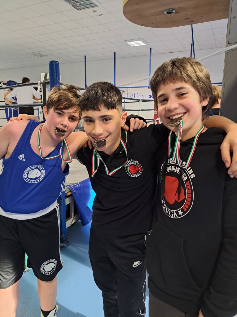 Oltre a Leonardo, ormai al settimo match, hanno fatto il loro debutto sul ring anche Valerio e Yari, accompagnati dal maestro Pierino Ruga, poi occupato nell’arbitraggio delle gare Gym Boxe, e dai tecnici Angelica Ruga ed Emiliano Demori.