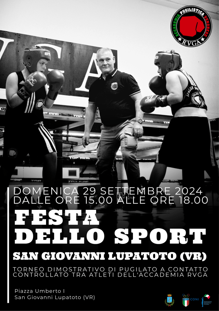 Domenica 29 settembre, in occasione della Festa dello Sport organizzata dal Comune di San Giovanni Lupatoto, si terrà un torneo dimostrativo di pugilato a contatto controllato tra gli atleti dell’Accademia RVGA in piazza Umberto I al fine di promuovere la boxe.