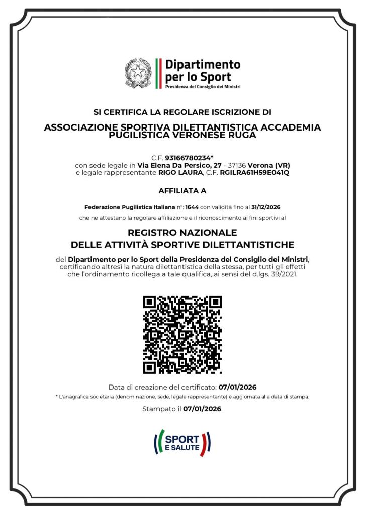 Ogni anno l’Accademia Pugilistica Veronese Ruga, come previsto dalla legge, conferma la propria iscrizione al Registro delle Associazioni e Società Sportive Dilettantistiche del CONI, sostituito a partire da gennaio 2023 dal Registro Nazionale delle Attività Sportive Dilettantistiche del Dipartimento per lo Sport della Presidenza del Consiglio dei Ministri, e rinnova la propria affiliazione alla Federazione Pugilistica Italiana.